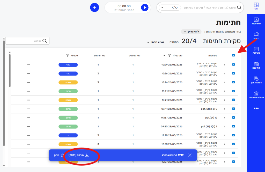 6. ניתן להוריד באופן מרוכז את המסמכים החתומים לקובץ ZIP על ידי סימון הצ'קבוקס של השורות הרלוונטיות ובחירה באפשרות "הורדה" בסרגל הכחול התחתון.
