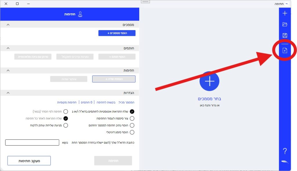 - יש להכין את המסמכים לחתימה ולמקם את החתימות לפי הצורך. שימו לב: באפשרות זו ניתן להחתים רק חותם אחד.