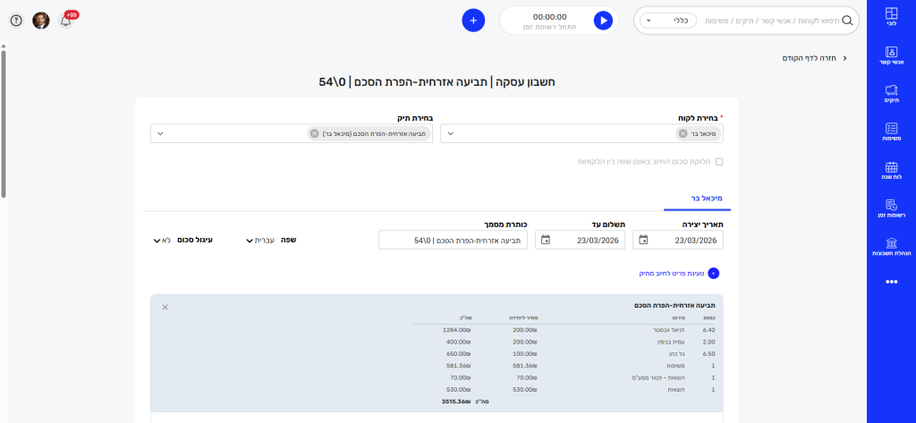 ניתן להפיק חשבונית מסוג חשבונית ריכוז, בה המסמך החשבונאי יוצג בסכומים מרוכזים לפי קטגוריות: שעות לחיוב (לפי משתמש), משימות והוצאות.