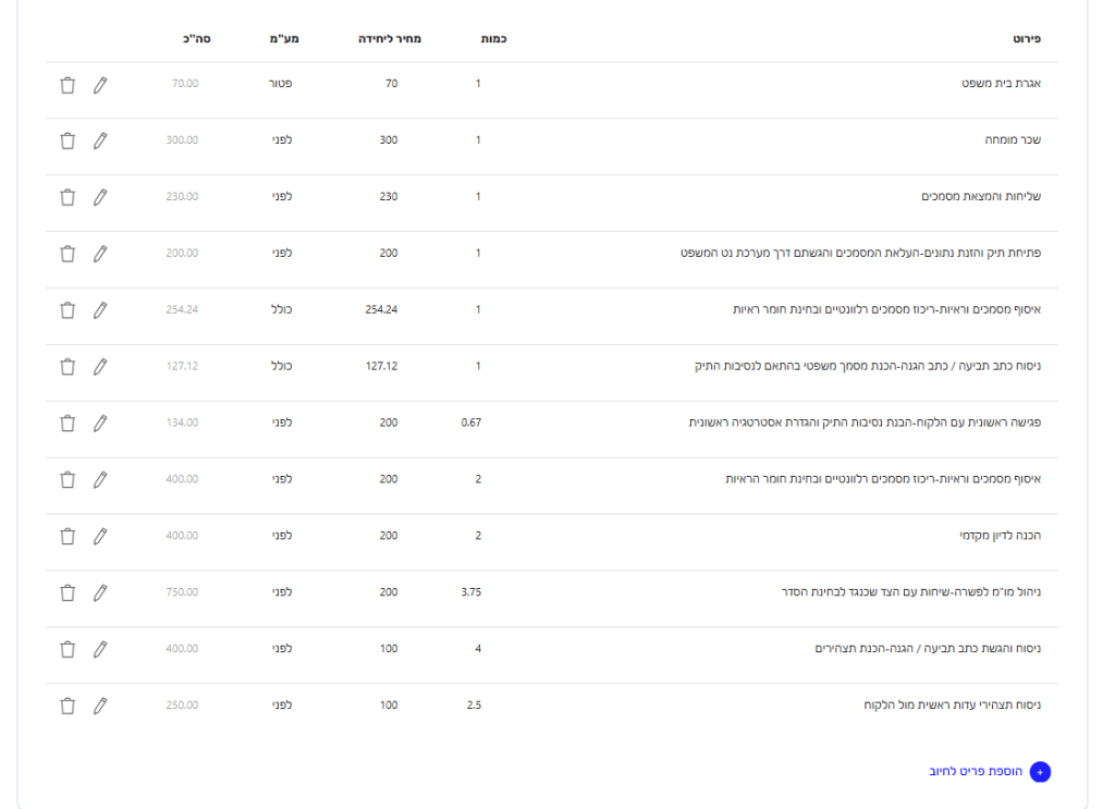 - נטען פריטים לחיוב שהזנו בתיק (משימות/ הוצאות/ שעות לחיוב/ אחוזי זכייה/ ריטיינר).