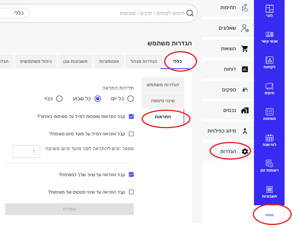 - ניתן לבחור בקבלת התראות שוטפות למייל על משימות באיחור או על מועד סיום משימה.