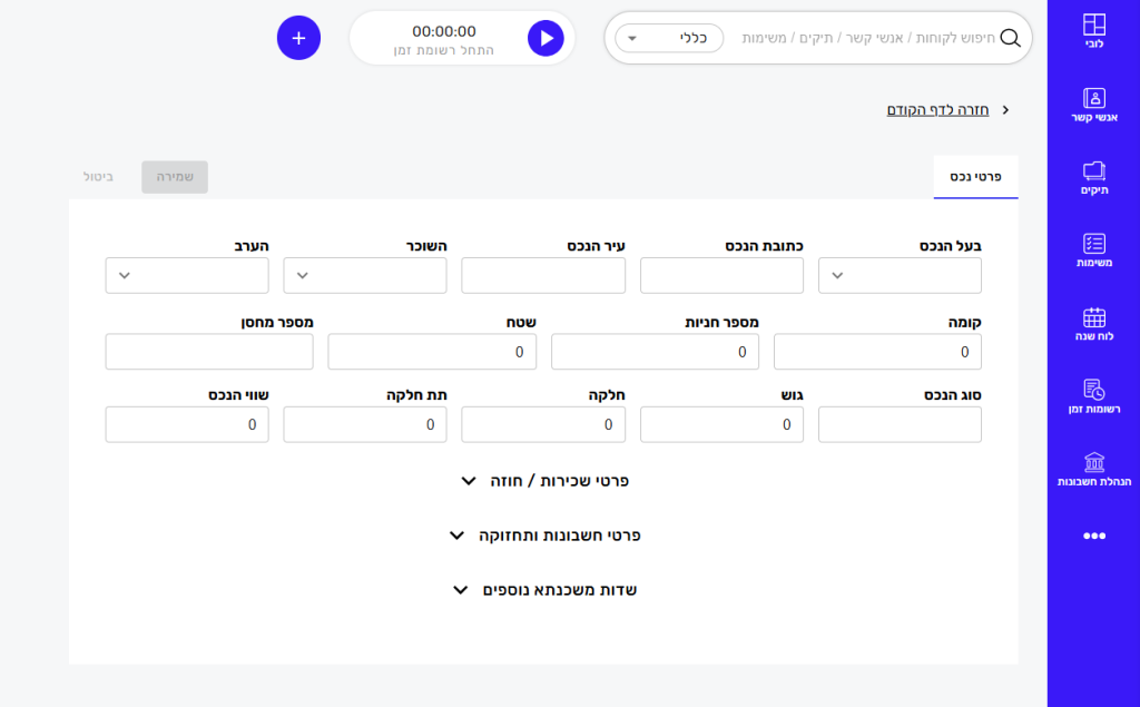 לתיקים מסוג מקרקעין יש אפשרות להוסיף נכסים כמו דירות, מבנים וקרקע הכוללים פרמטרים שונים ביניהם: בעל הנכס, כתובת הנכס, השוכר, הערב, דמי שכירות, תקופת שכירות, שטח ועוד…