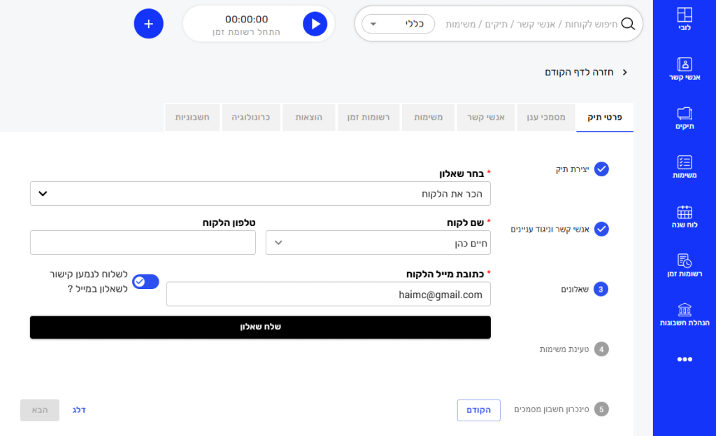 1. פרטי התיק: נזין את כל פרטי התיק: שם, סוג, סטטוס, תיאור, מספר תיק בית משפט, משתמשים משויכים ושותף אחראי.