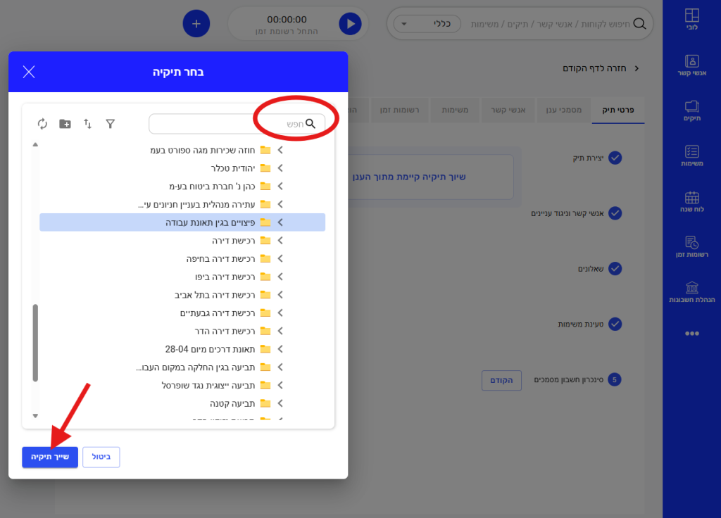 2. שיוך תיקייה קיימת מהענן– תחילה יתבצע חיפוש אוטומטי של התיקיה בענן לפי שם התיק שהגדרתם ותוכלו לבחור את התיקיה המתאימה. במידה ולא נמצאה תיקיה מתאימה ניתן לשייך ידנית.
