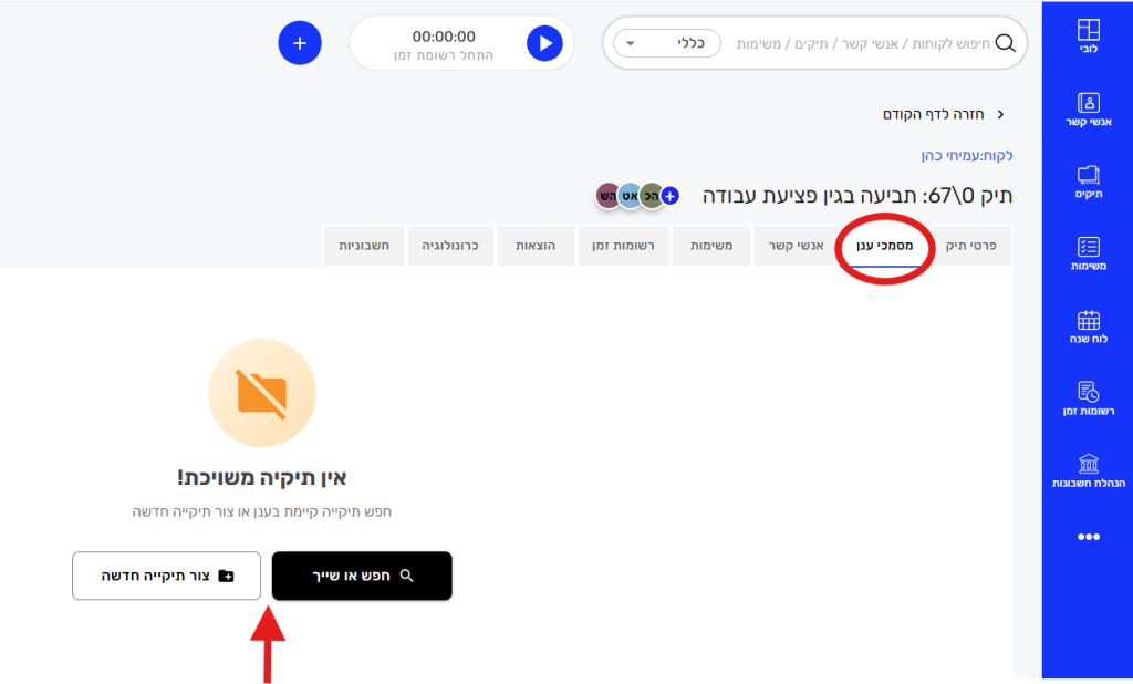 - יש להכנס לכרטיסיית "תיקים", לבחור את התיק ולהיכנס ללשונית "מסמכי ענן".