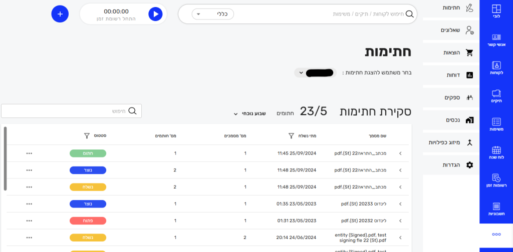 - בכרטיסיית חתימות ניתן לנהל מעקב חתימות לפי משתמש, תאריכים, סטטוסים ושמות מסמכים.